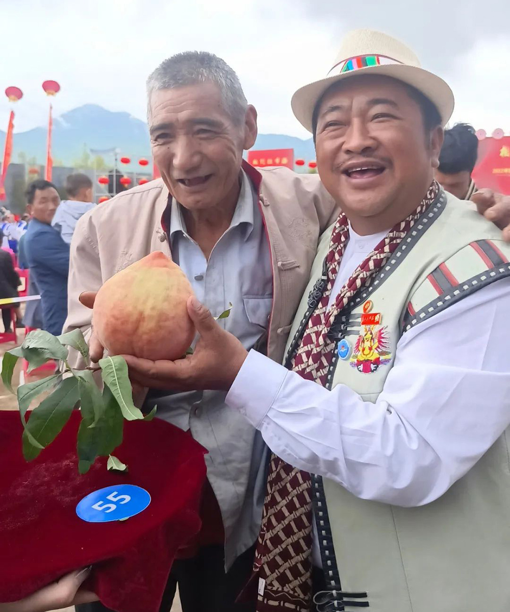 麗江雪桃產(chǎn)業(yè)協(xié)會會長楊四龍與“桃王”種植戶木華章合影